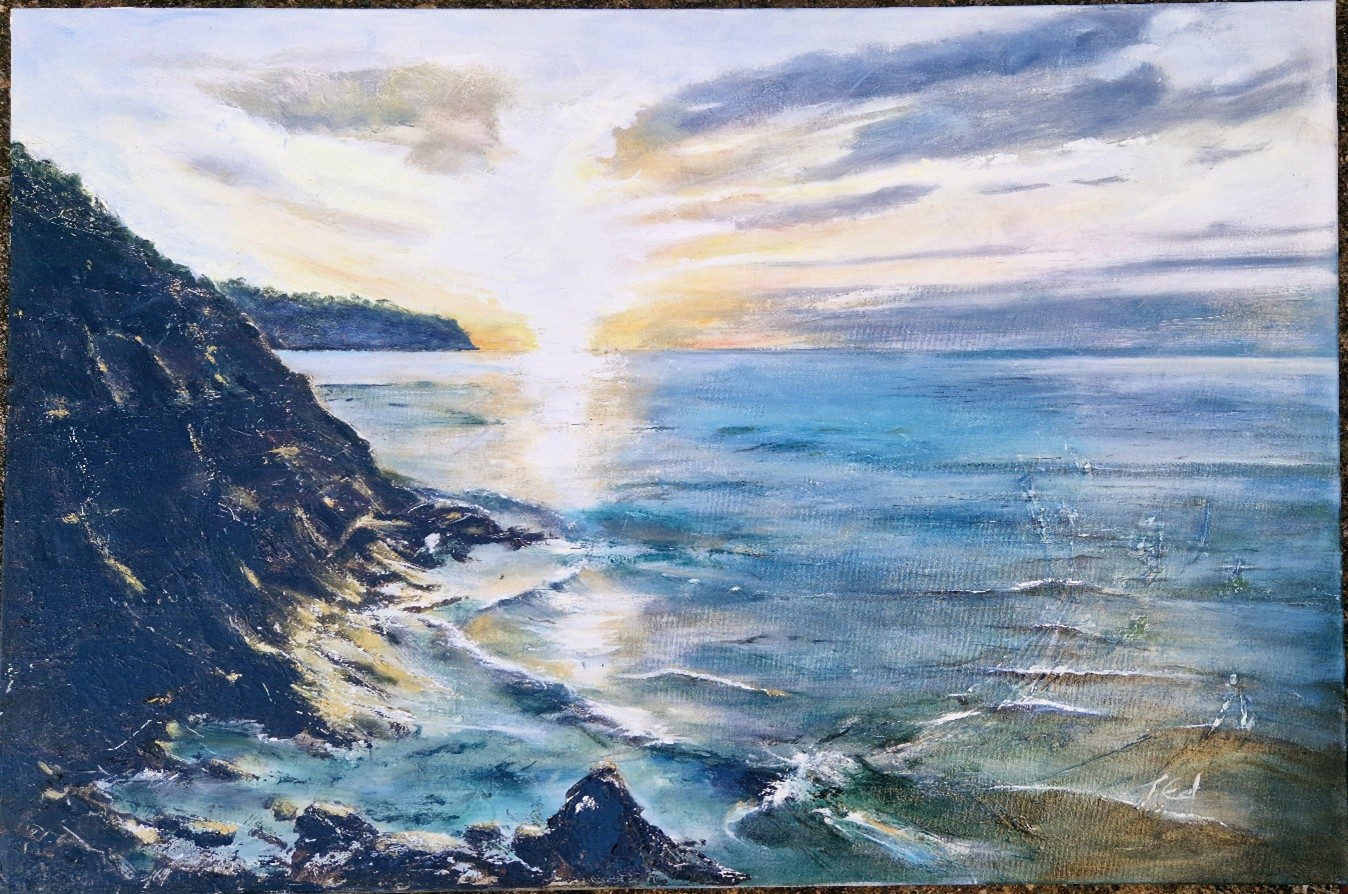 ‘Devon based artist Trish Edwards is a versatile and talented painter, working in acrylics, oil, watercolours and mixed media. Her particular interests are seascapes, portrait and life painting and drawing. She is a member of the Teignmouth Art society, winning the Albert Smith Award for Marine painting in Summer 2022 and Summer 2024, the Alan Cotton (Presidents Choice) Award Summer 2023, Visitors Choice Award 2025 and Marjorie Matthews Tankard (Public Choice) for Portrait Spring 2025.